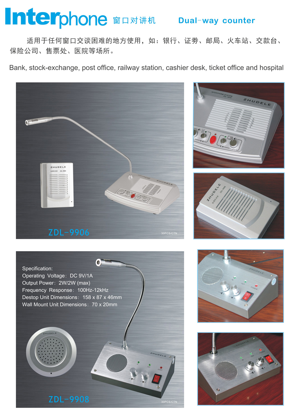 · 该产品可以用在任何窗口交谈困难的地方使用,如:银行、证劵、邮局、火车站、交款台、保险公司、售票处、医院等场所。是产品更新换代的理想选择。